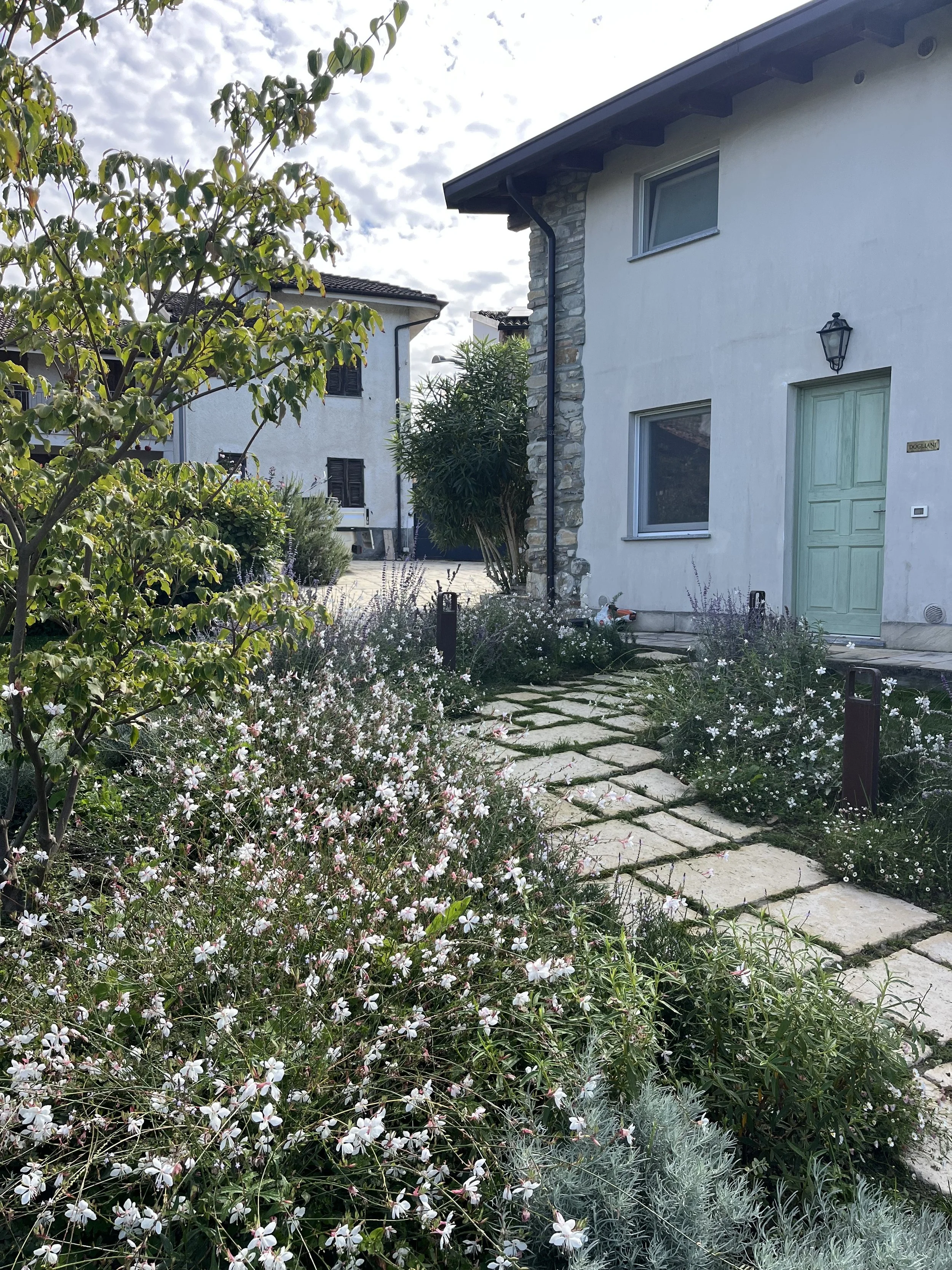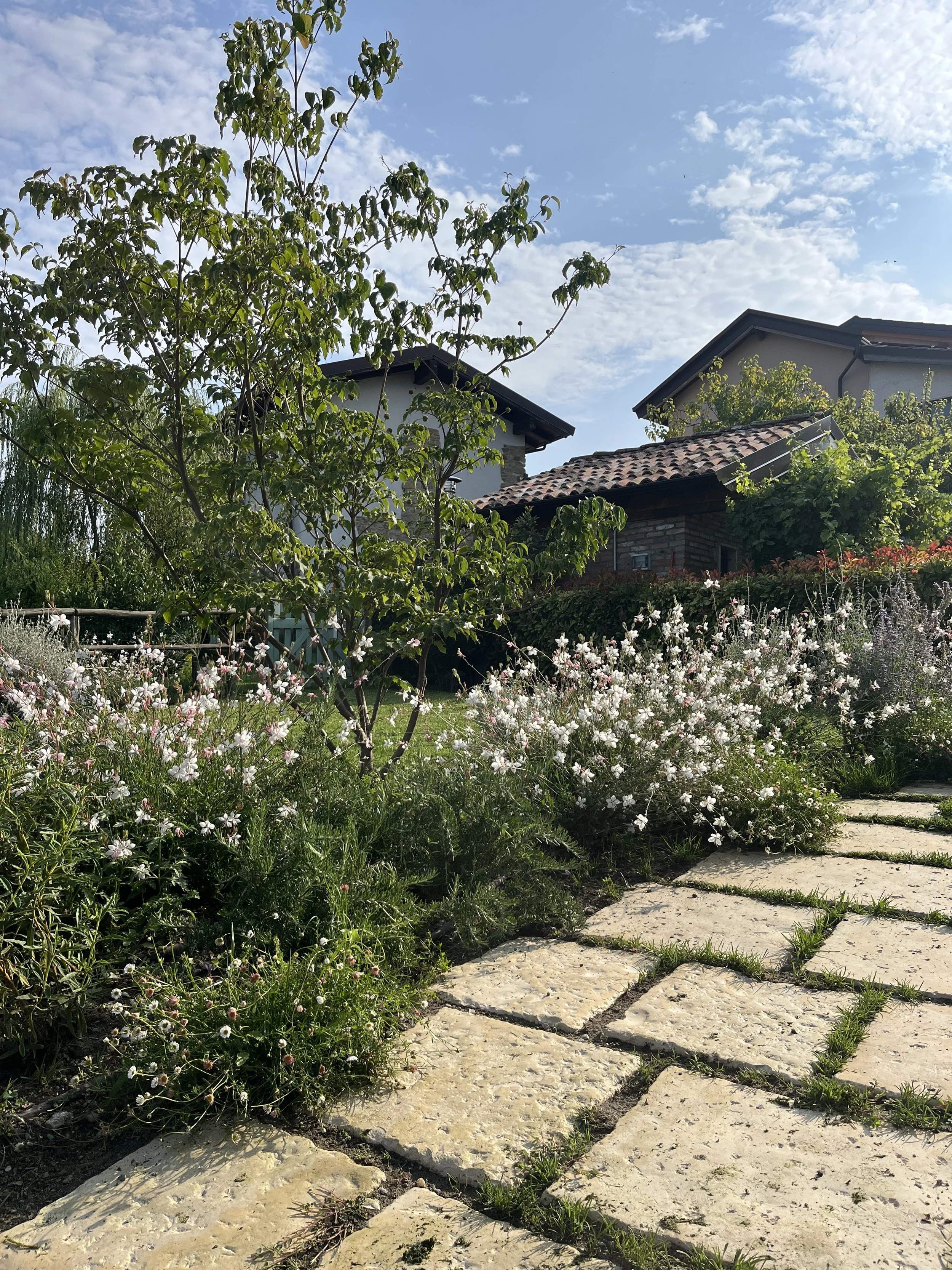 Ai lati del percorso, così come lungo il perimetro del giardino, sono state realizzate aiuole che accolgono le stesse essenze vegetali utilizzate nel grande vascone in pietra, mantenendo così coerenza e continuità visiva in tutto il progetto.